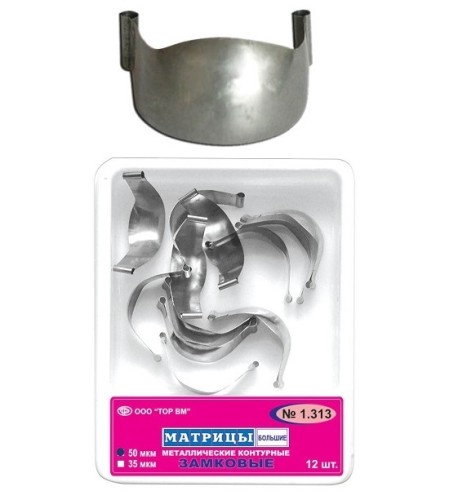 Контурные замковые большие металлические матрицы 1.313 используется для разведения апроксимальных зубных поверхностей. Применяются для контурирования пломб из композитных материалов всех типов, удерживается через проушины специальными кольцами.