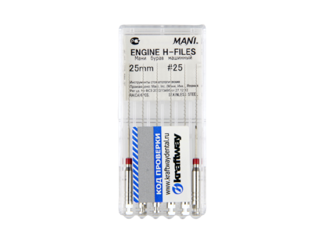 Н-Файлы Энжин №25 от японской компании Mani – это высококачественные машинные инструменты длиной 25 мм, изготовленные из прочной нержавеющей стали. Их спиралевидная режущая часть обеспечивает гибкость и точность обработки. Отличаются повышенной износостойкостью, что гарантирует долговечность и эффективность в сложных клинических условиях.