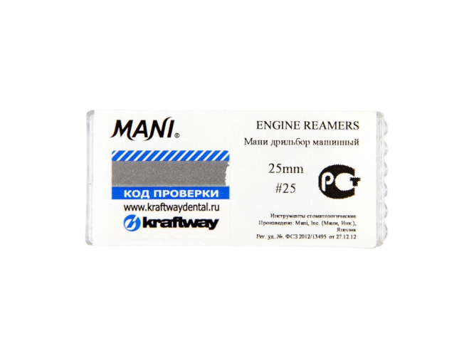 Машинные дрильборы Engine Reamers 25 от бренда Mani – эндодонтический инструмент для расширения зубных каналов. Он закрепляется в угловом наконечнике и работает на малых оборотах, расширяя канал.