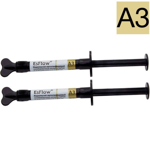 EsFlow Spident А3 – жидкотекучий композит со световым механизмом отверждения. Он применяется для заполнения полостей малых размеров как на фронтальных, так и на жевательных группах зубов.