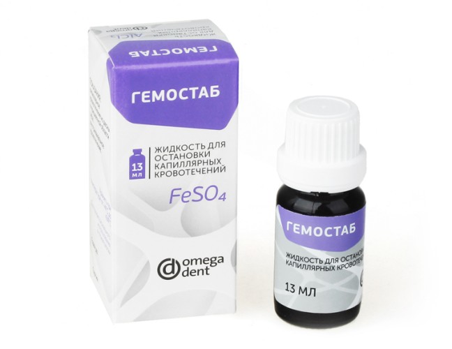 Гемостаб FeSO4 – средство с железом для остановки капиллярных кровотечений. Используется для большинства стоматологических операций в качестве кровеостанавливающего медикамента. Также, широко применяется для инфильтрации крови из десны в пришеечной зоне зуба и апикальных кровотечениях.