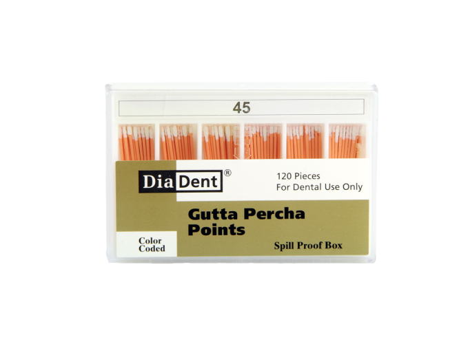 Перед установкой гуттаперчевый штифт № 45 DiaDent разогревается, становится пластичным, поэтому заполняет собой весь объем полости. Они отличаются рентгеноконтрастными свойствами, не вызывают аллергических реакций.