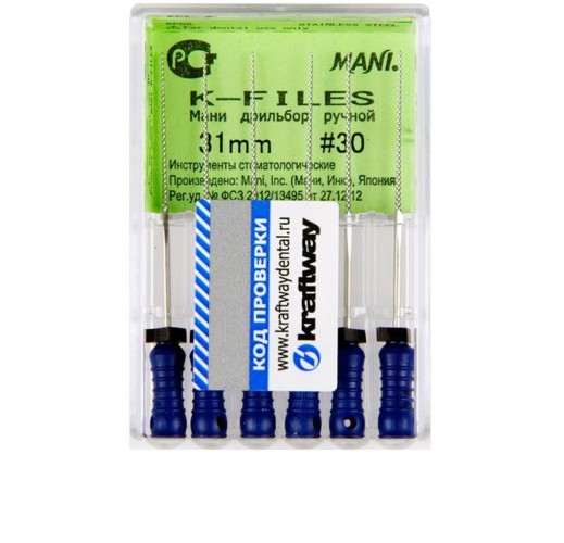 В магазине Юдента можно заказать К-файлы № 30 Mani в кейсах на 6 штук по цене от производителя. Менеджер ответит на вопросы и оформит покупку, товар доставляется транспортной компанией или курьером, предлагается самовывоз со склада.