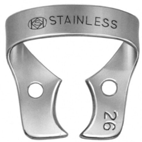 Кламп для Раббердама № 26 производства DENTECH может устанавливаться на моляры в верхней, а также нижней челюсти. Может использоваться в качестве якоря на зубах среднего размера, может устанавливаться на сильно разрушенную коронковую часть.